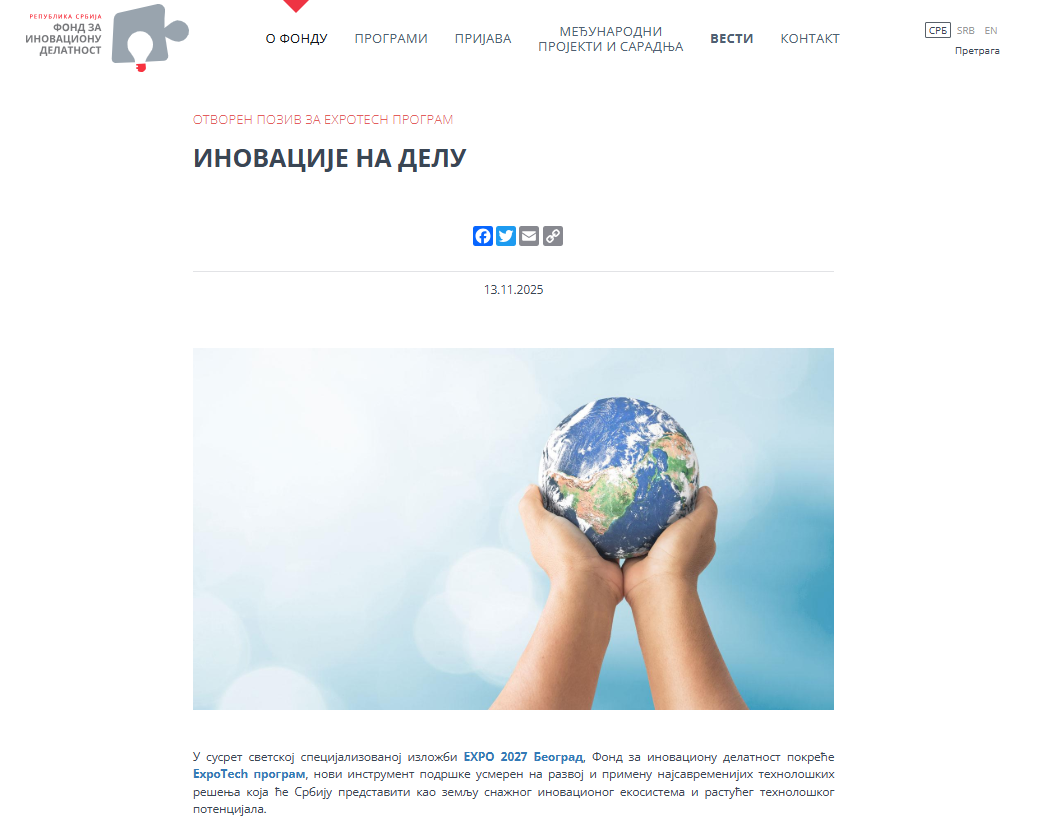 The Innovation Fund of Serbia has opened the call “Innovations in Action” to support the development and implementation of advanced technological solutions that can be showcased in the context of EXPO 2027 Belgrade.