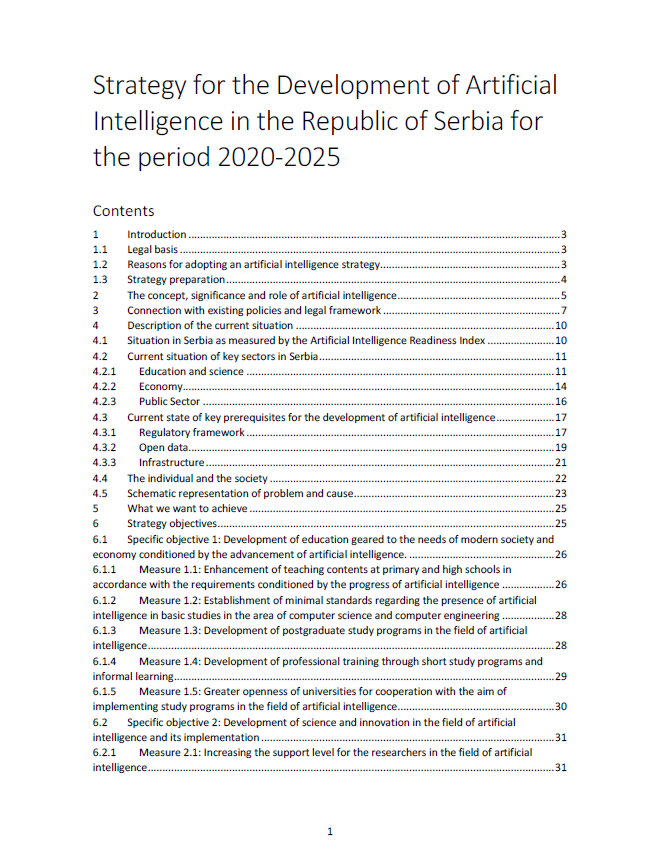 The Strategy for the Development of Artificial Intelligence in the Republic of Serbia for the period 2020-2025 (hereinafter: Strategy) defines objectives and measures for the development of artificial intelligence whose implementation should result in economic growth, improvement of public services, advancement of scientific staff, and development of skills for the jobs of the future. Also, the implementation of the Strategy measures should ensure that artificial intelligence in the Republic of Serbia is developed and implemented in a safe manner and in accordance with internationally recognized ethical principles, in order to exploit the potential of this technology to improve the quality of life of each individual and the society as a whole, as well as to achieve Sustainable Development.