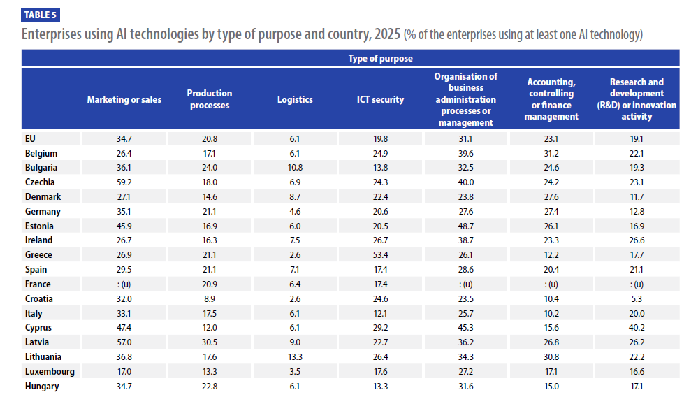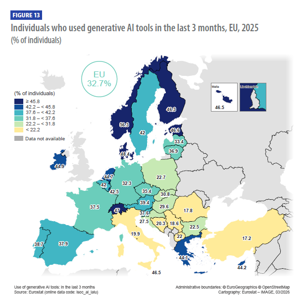 The report “The use of artificial intelligence technologies in the European Union – Key results – 2026 edition” by Eurostat provides a statistical overview of AI adoption in the EU, but includes also available results from enlargement countries.