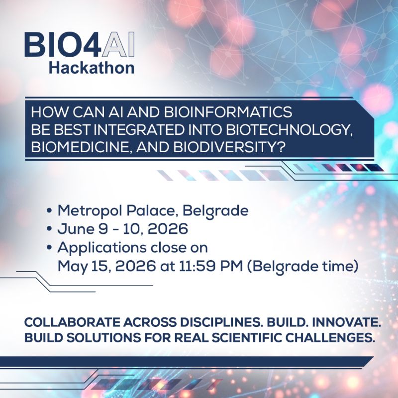 The BIO4AI Hackathon at BelBi 2026 takes place 9-10 June 2026 at Metropol Palace Hotel, Belgrade, Serbia.