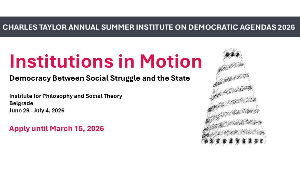 The Institute for Philosophy and Social Theory (IFDT) at the University of Belgrade invites applications for the 2026 Charles Taylor Annual Summer Institute on Democratic Agendas â Institutions in Motion: Democracy Between Social Struggle and the State.