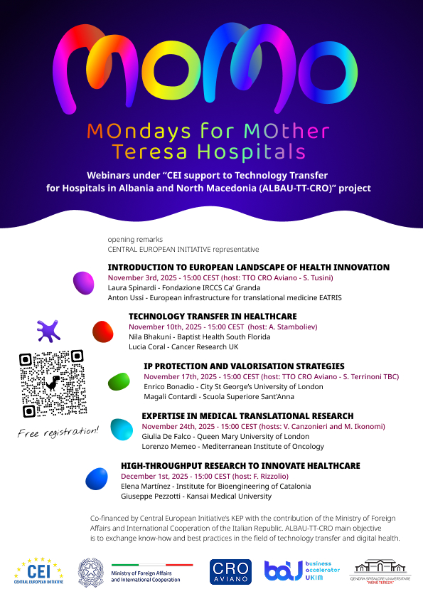 As part of the “CEI Support to Technology Transfer for Hospitals in Albania and North Macedonia (ALBAU-TT-CRO)” project, a series of training webinars will take place from 3 November to 1 December 2025. The project, co-financed by the Central European Initiative’s KEP with the contribution of the Ministry of Foreign Affairs and International Cooperation of the Italian Republic, aims to exchange know-how and best practices in technology transfer and digital health.