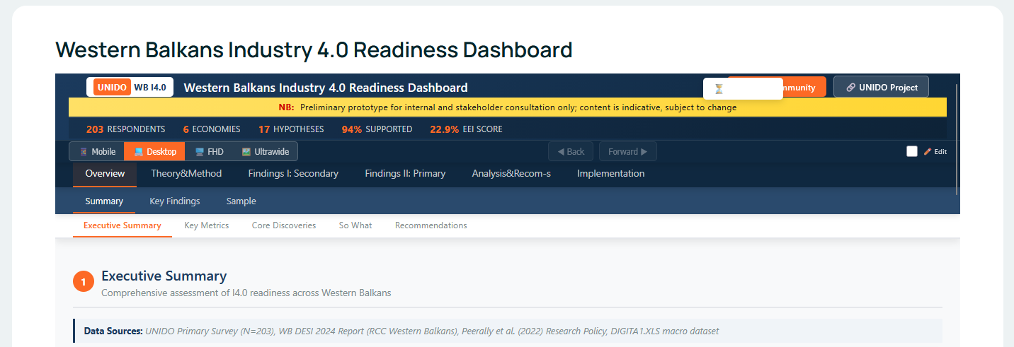 The Western Balkans Industry 4.0 Readiness Dashboard is a prototype, interactive policy tool developed under the UNIDO project “Fostering Industry 4.0 for Green Transition and Circular Economy in the Western Balkans” to provide an empirical, ecosystem-level assessment of Industry 4.0 readiness in six Western Balkan economies. It consolidates data from more than 200 respondents (SMEs, Business Support Organisations, government bodies) and integrates survey evidence with regional digital indicators (such as WB DESI 2024) and a macro dataset on Industry 4.0 capabilities to test theoretically grounded hypotheses about digital and green transformation pathways.