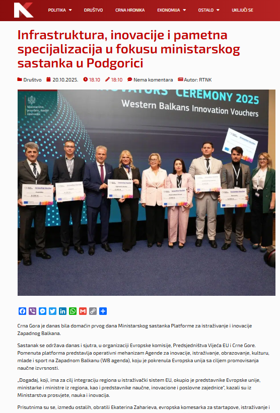 On the first day, news portals frequently highlighted European Commissioner Ekaterina Zaharieva and EU Ambassador Johann Sattler, who welcomed the ministers to Podgorica, describing the meeting as a crucial opportunity to strengthen cooperation in research and innovation between the European Union and the Western Balkans. The media reported about the importance of transforming the region’s scientific and entrepreneurial potential into economic growth, based on a press release issued by the Montenegrin Ministry. Coverage of the second day focused on a bilateral meeting between Commissioner Zaharieva and Montenegro’s Minister of Education, Science and Innovation, Andjela Jaksic-Stojanovic, attended by Minister of European Affairs Maida Gorcevic. According to the Ministry’s press release, the Commissioner reiterated that the EU and Montenegro are strong partners in research and innovation. She noted Montenegro’s significant progress since joining EU programmes in 2008 and highlighted its distinction as the first non-EU country to adopt the Smart Specialisation Strategy, facilitating access to European funds and fostering collaboration between academia and industry in key development areas.